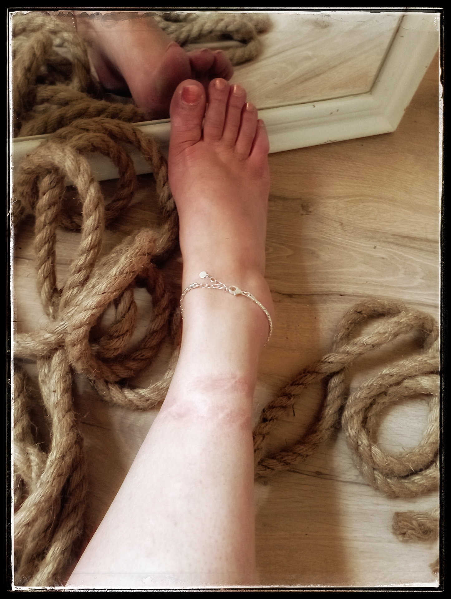 Deze serie was een intuïtief experimenteren, ik had geen uitgewerkt idee. Ik wilde iets met touw en ik vind foto’s maken met de spiegel een fijne manier van werken. Wat ik niet voorzien had was wat het met me deed. Het gevoel van touw op mijn huid had me bij een diepere laag in mijzelf gebracht, ik was zonder het me bewust te zijn in een dynamiek van overgave gestapt. Zonder partner, zonder wisselwerking, vanuit verdriet om het gemis van die wisselwerking, ik heb naderhand wat traantjes gelaten en ben in de veilige bubbel van mijn bed gestapt.