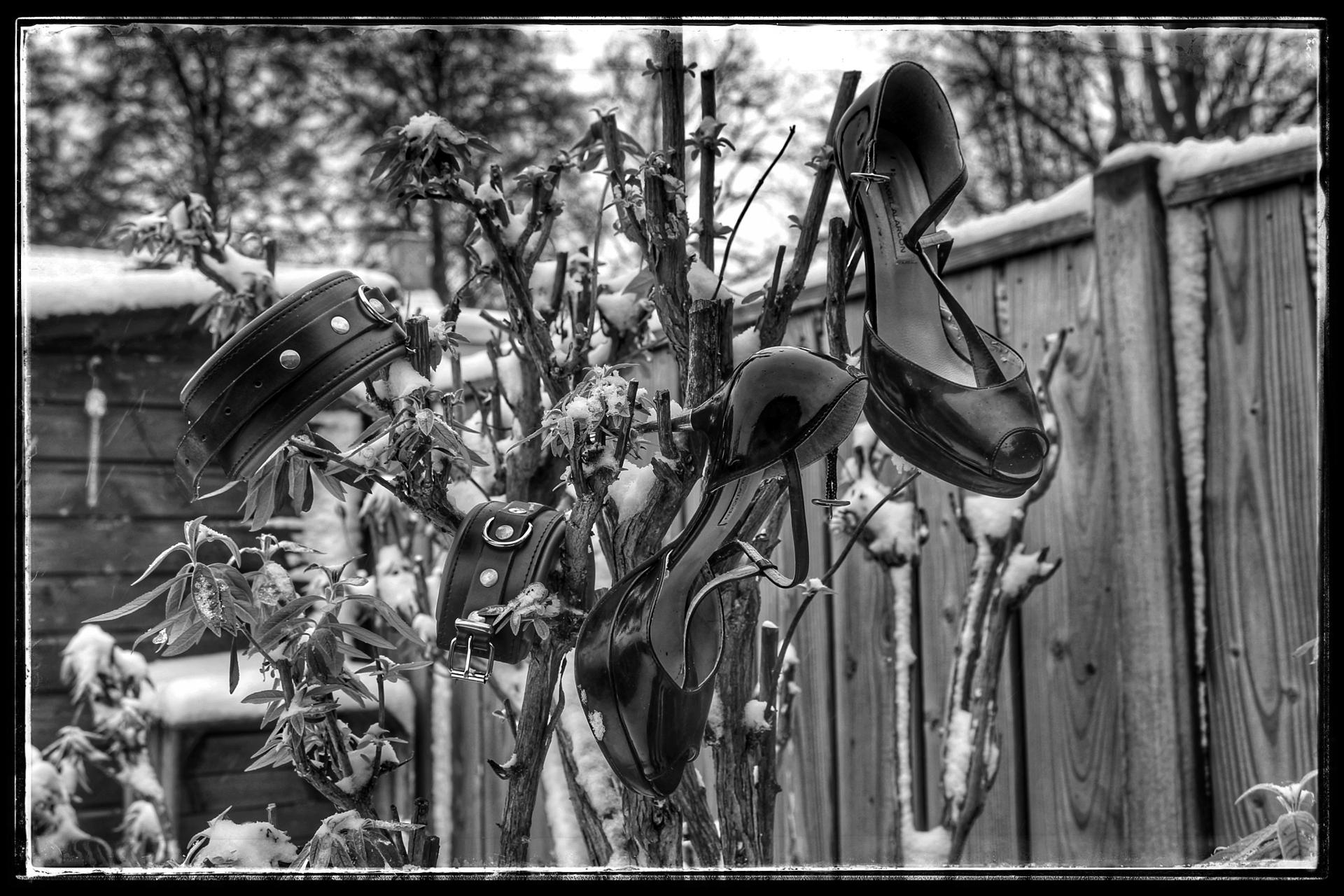 Het had gesneeuwd, een mooie witte deken had onze wereld voor eventjes omgetoverd tot een sprookjesland. In mijn hoofd ontstond een idee, nou ja om eerlijk te zijn was het oorspronkelijke idee een paar erotische fotos in de sneeuw. Maar dat kan mijn lichaam niet aan dus ik moest omdenken om min creatieve brein bezig te houden. Het werd een bdsm stilleven in de sneeuw.